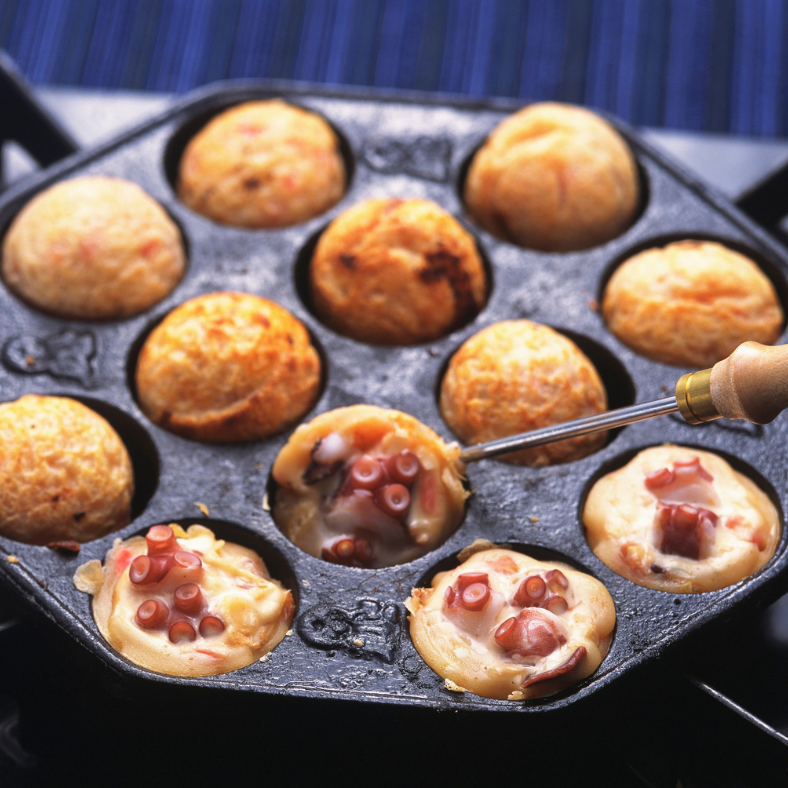 Takoyaki is made in a takoyaki grill, or “takoyaki-ki,” a specialized cast-iron pan with domed molds that give the balls their unique round shape. It is central to the cooking method and helps create takoyaki’s crispy exterior and soft interior.